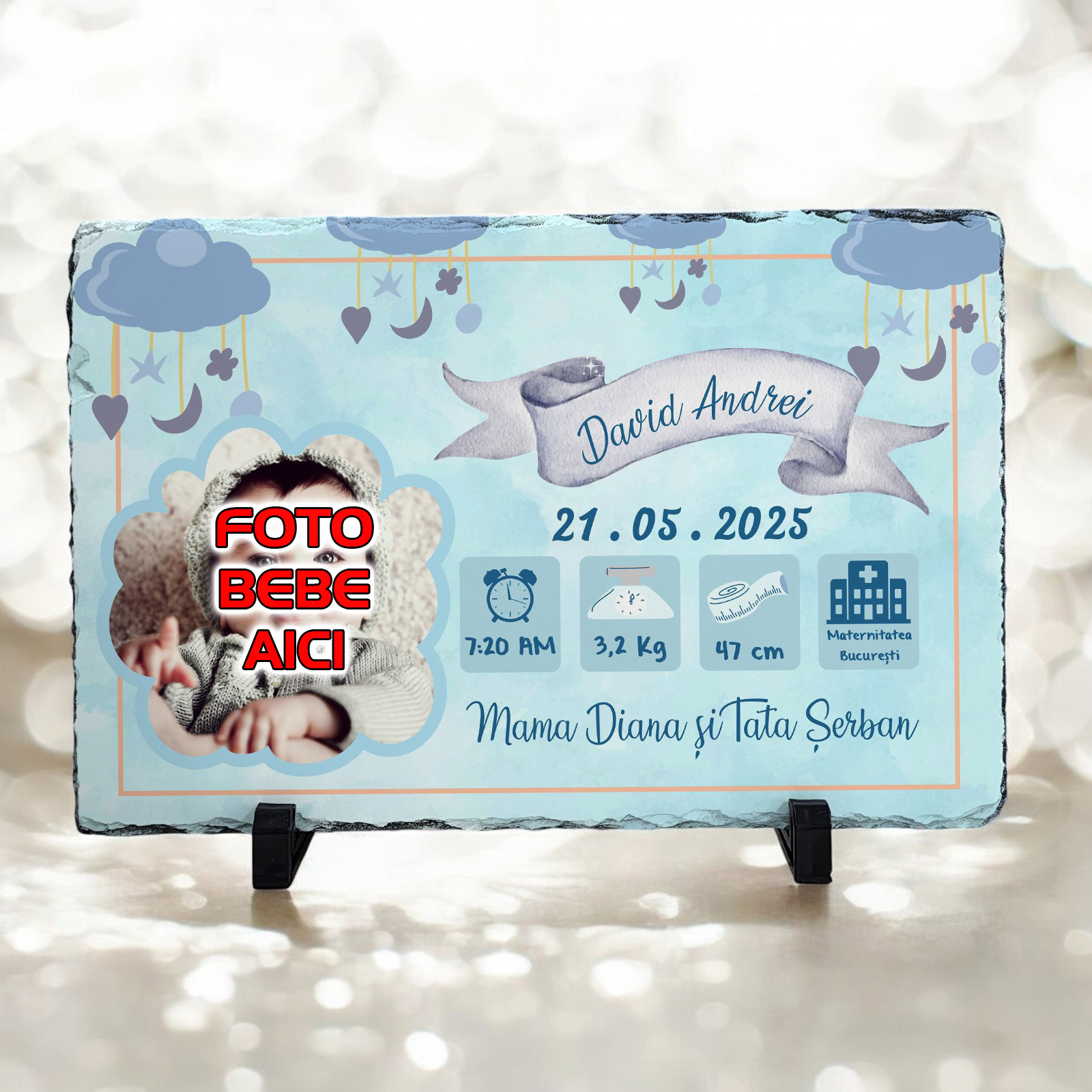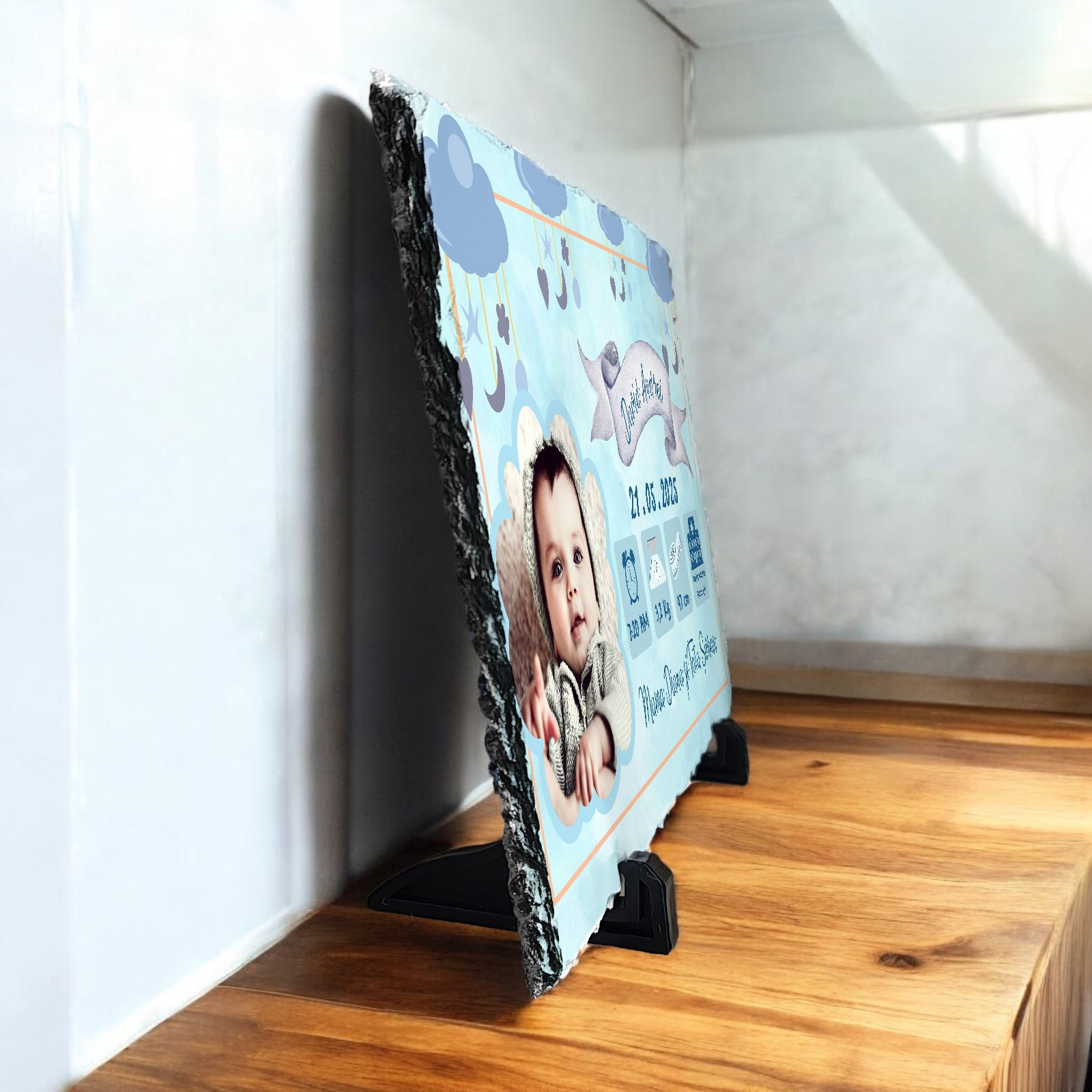 Această piatră de ardezie păstrează pentru totdeauna clipa magică în care ai venit pe lume.