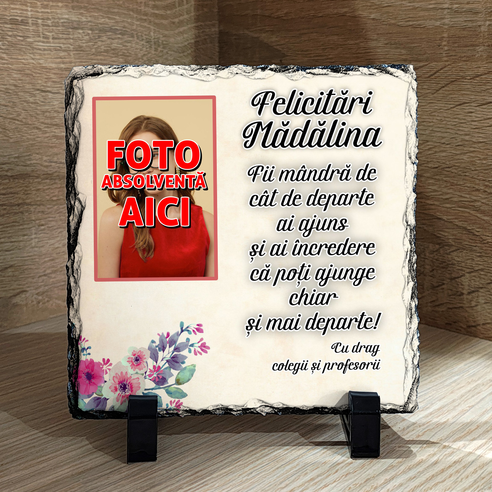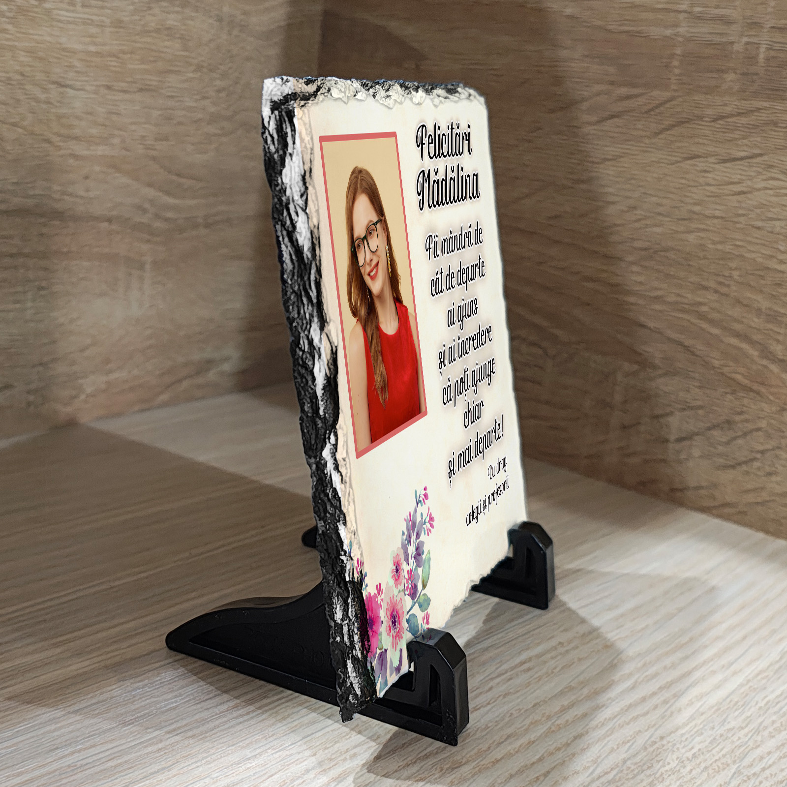Transformă un moment de neuitat într-o amintire eternă cu această placă de ardezie naturală, personalizată cu fotografia preferată și un mesaj special dedicat absolventei. Cu margini neregulate ce păstrează frumusețea brută a pietrei și o imprimare de înaltă calitate, această piesă este perfectă pentru a celebra succesul și începutul unui nou capitol.