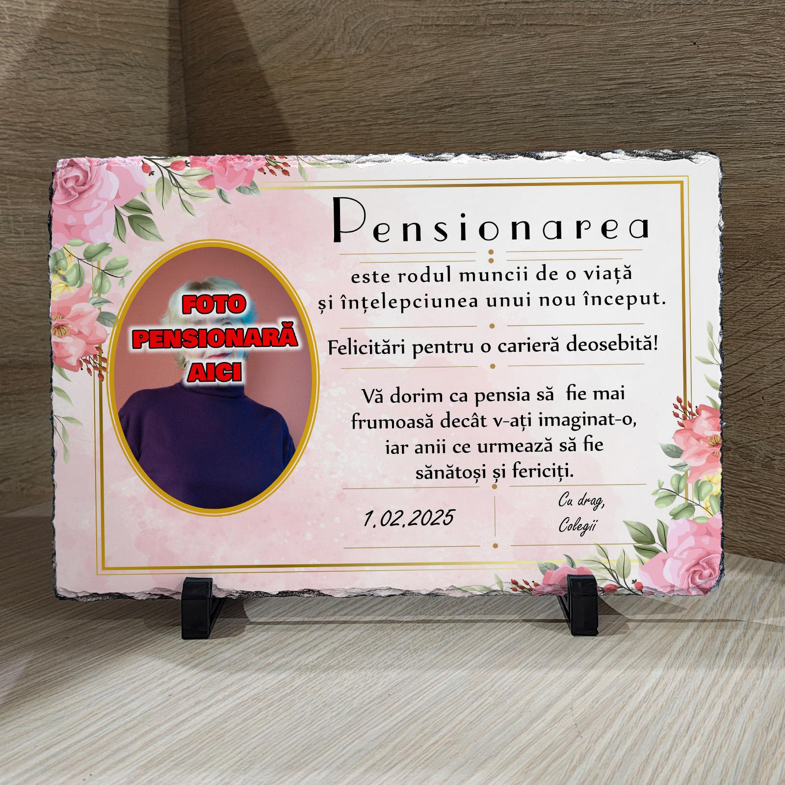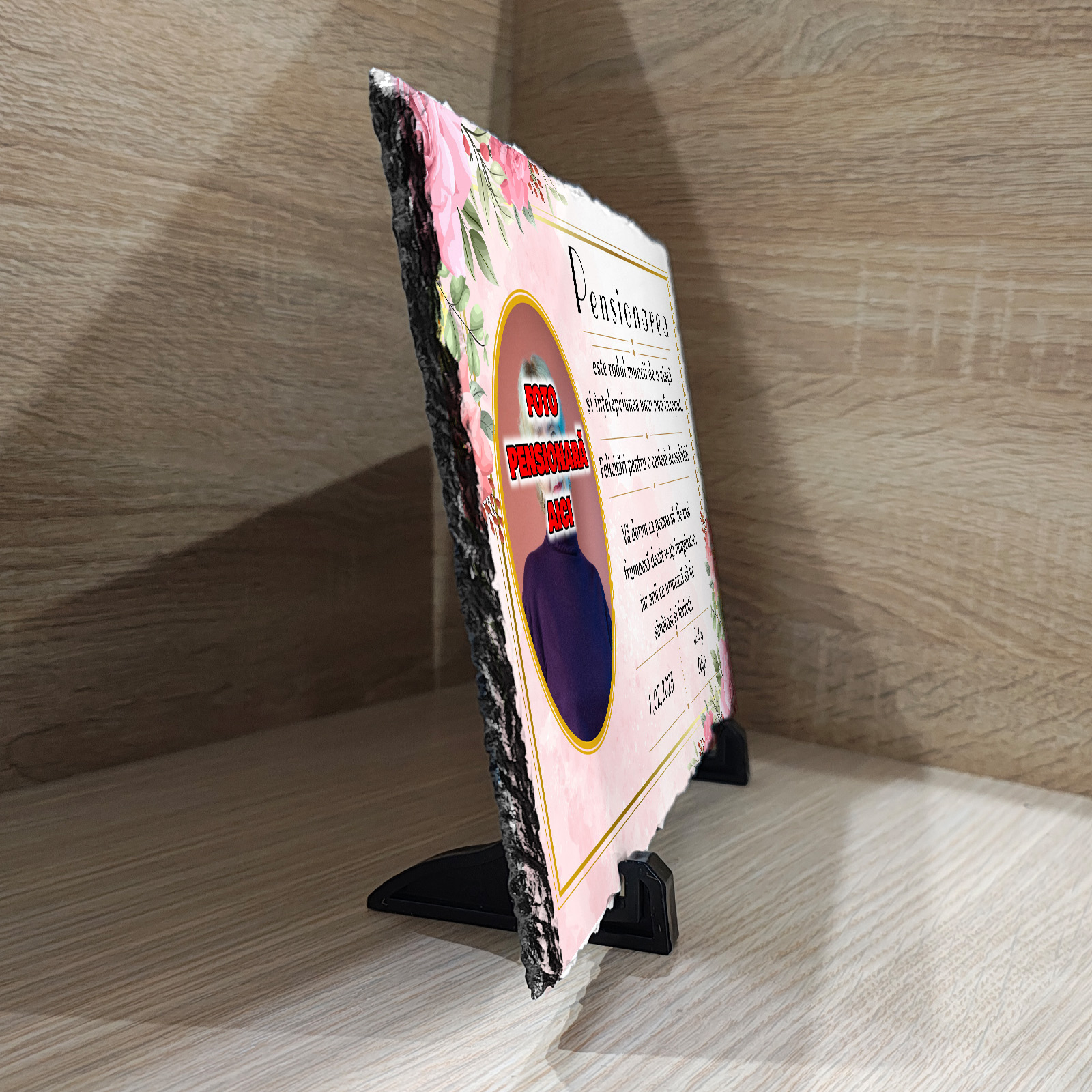 Oferă un cadou cu adevărat memorabil și plin de semnificație cu această piatră de ardezie naturală, personalizată cu fotografie și un mesaj emoționant dedicat unui moment special – pensionarea. Cu margini neregulate și un finisaj rustic, această placă elegantă este ideală pentru a marca sfârșitul unei cariere remarcabile și începutul unei noi etape pline de liniște și împlinire.