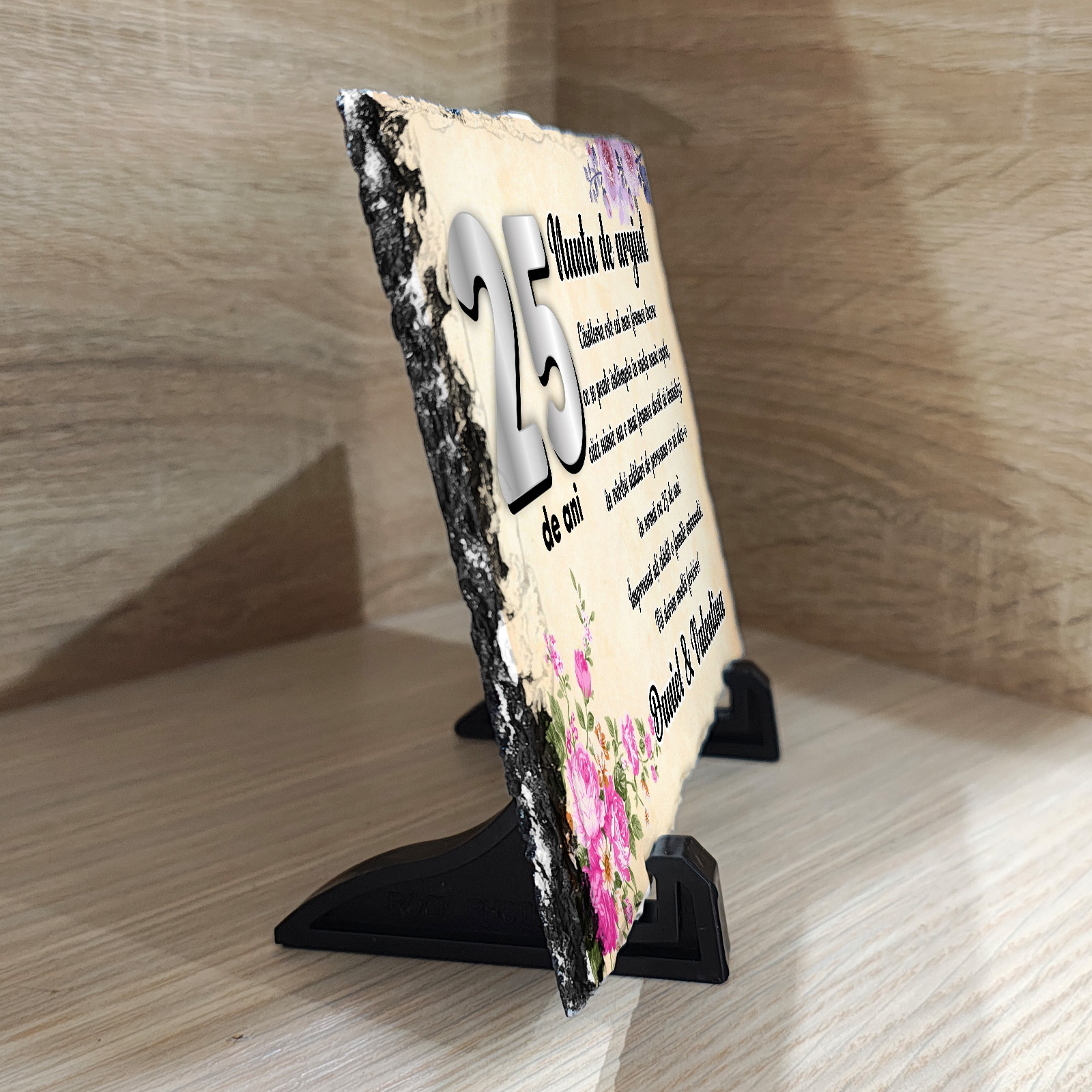 Celebrați 25 de ani de iubire, loialitate și amintiri prețioase cu o placă de ardezie elegantă, personalizată special pentru aniversarea nunții de argint. Realizată din piatră naturală de ardezie, această piesă unică combină durabilitatea cu rafinamentul, fiind un simbol perfect al unei relații care a trecut testul timpului.