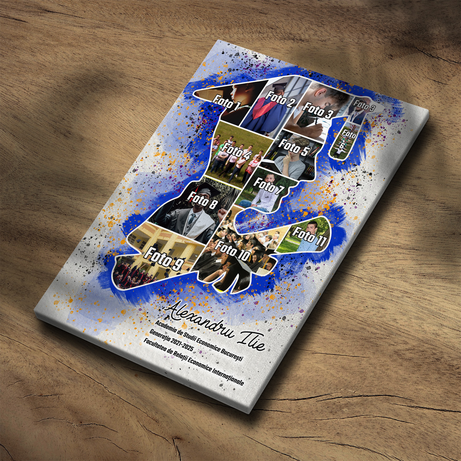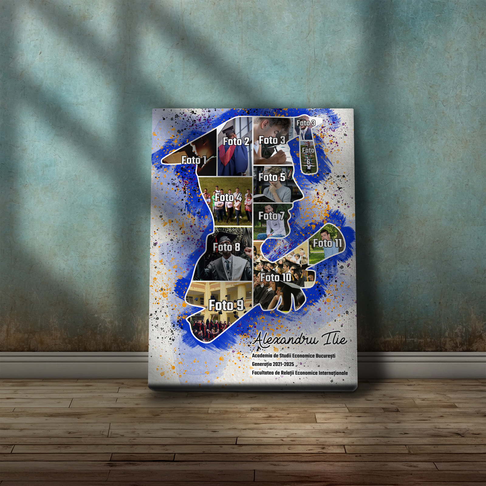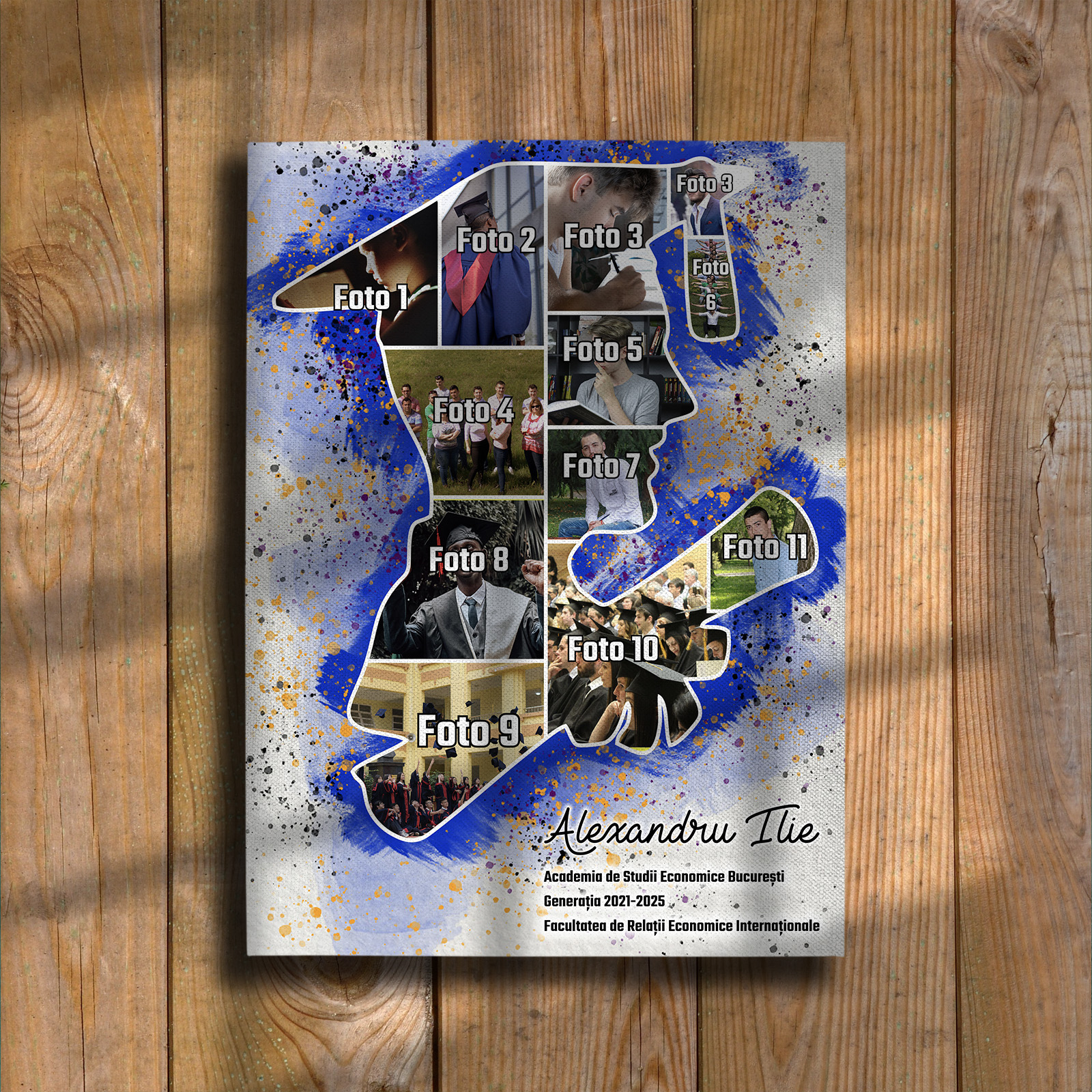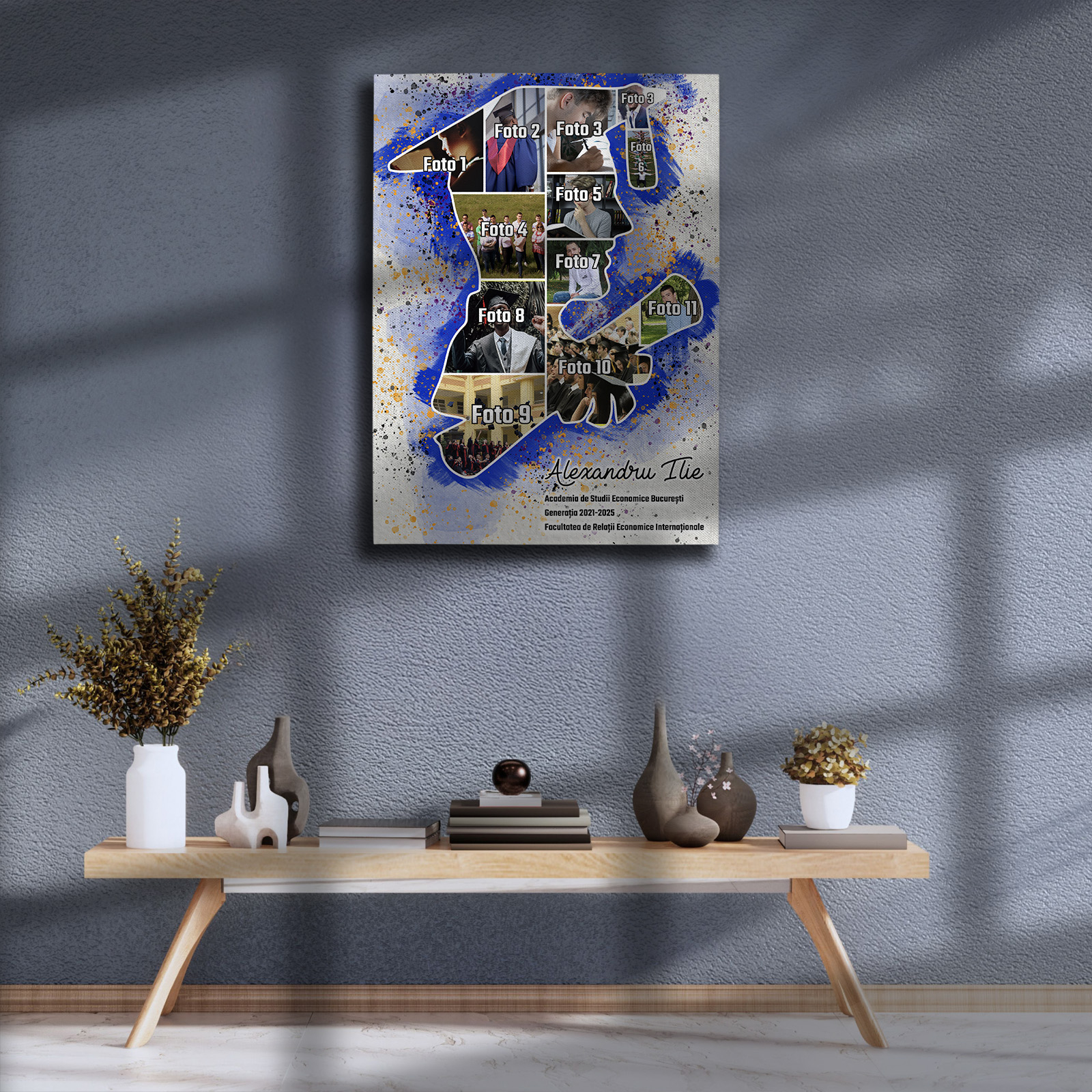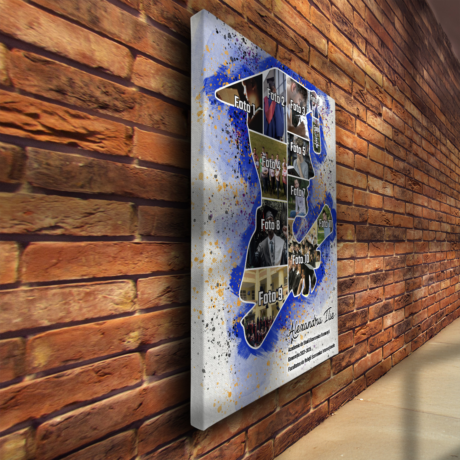 Tablou canvas personalizat pentru absolvent – un colaj elegant cu 11 fotografii care surprind cele mai frumoase momente ale parcursului academic. Un cadou memorabil, plin de emoție și recunoștință, perfect pentru a celebra o etapă importantă din viață.